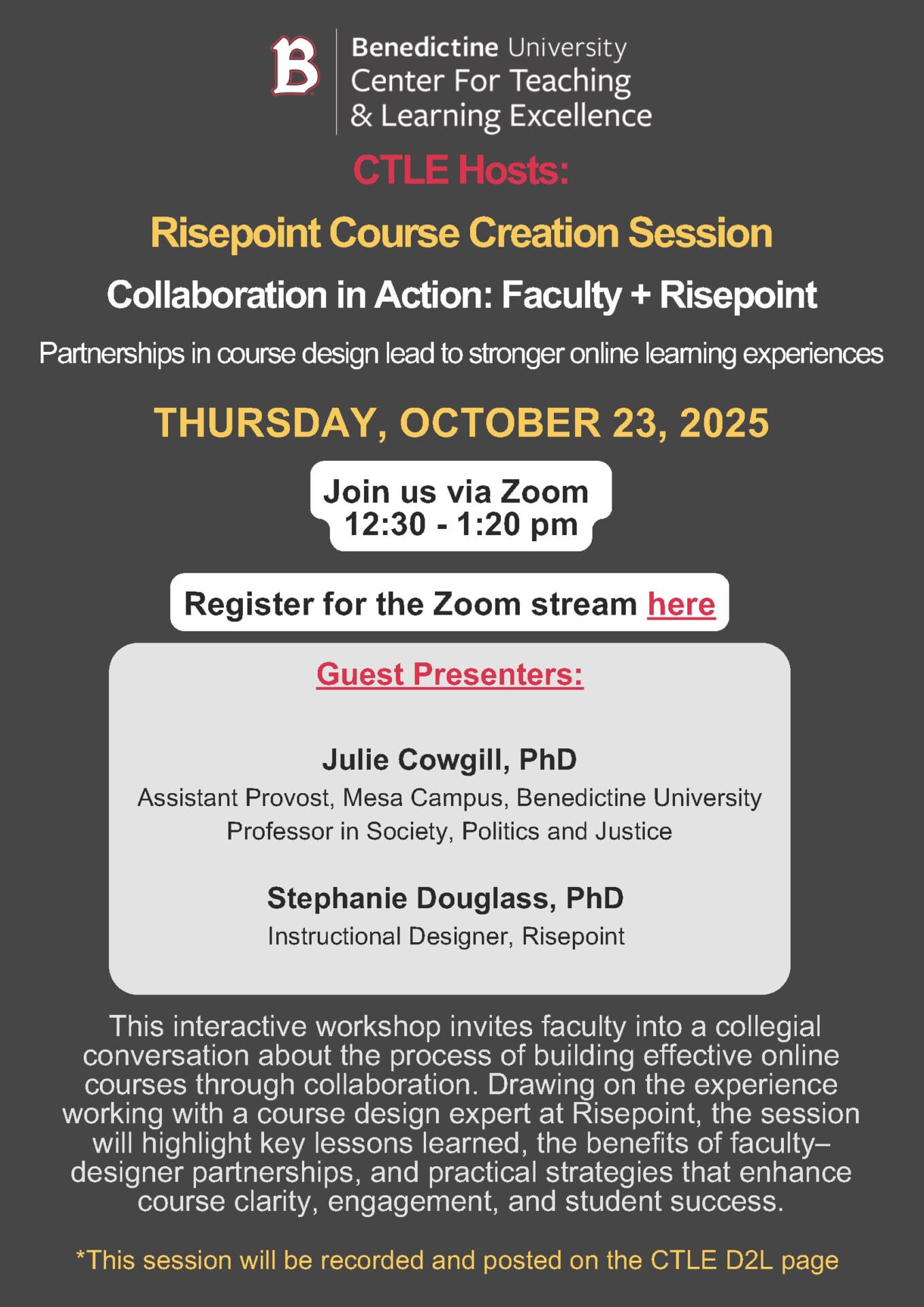 ![]() Collaboration in Action: Faculty + Risepoint Discover how partnerships in course design lead to stronger online learning experiences. Dr. Julie Cowgill, Assistant Provost of the Mesa Campus, and Dr. Stephanie Douglass, Instructional Designer at Risepoint, will be presenting a Risepoint course creation overview. This interactive workshop invites faculty into a collegial conversation about the process of building effective […] |