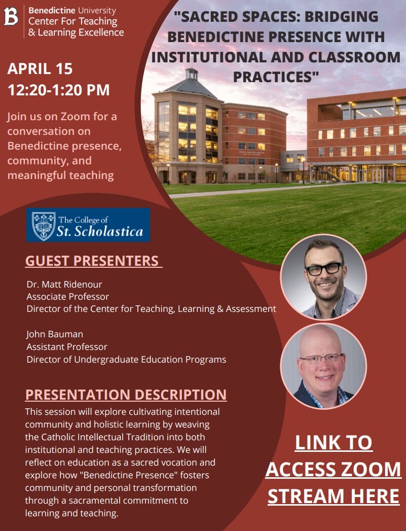 Join colleagues from across our campuses for a motivational Zoom session on April 15, featuring guest speakers from The College of St. Scholastica. “Sacred Spaces: Bridging Benedictine Presence with Institutional and Classroom Practices” Description: This session will explore cultivating intentional community and holistic learning by weaving the Catholic Intellectual Tradition into both institutional and teaching practices. We will reflect […] |