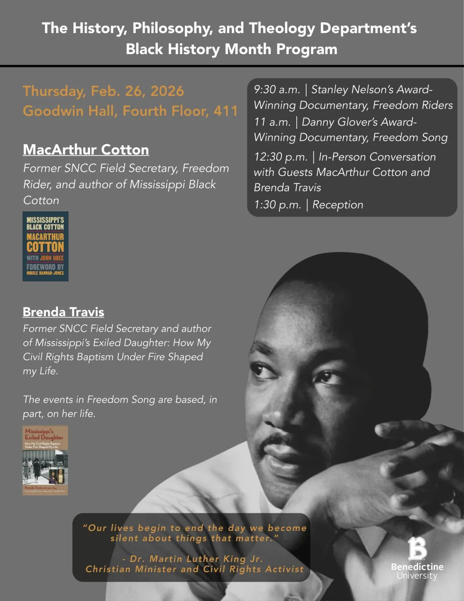 Presented by the History, Philosophy, and Theology Department Thursday, Feb. 26, 2026 | Goodwin Hall, Fourth Floor, 411 9:30 a.m. | Stanley Nelson’s Award-Winning Documentary, Freedom Riders 11 a.m. | Danny Glover’s Award-Winning Documentary, Freedom Song 12:30 p.m. | In-Person Conversations with Guests MacArthur Cotton and Brenda Travis MacArthur Cotton Former SNCC Field Secretary, Freedom […]