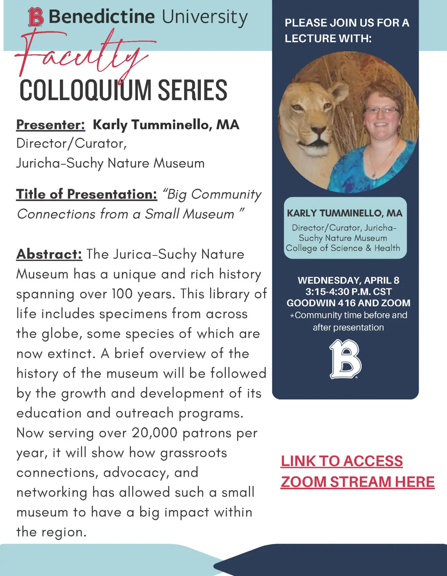 Please join us for a Faculty Colloquium Series! Title of Presentation: “Big Community Connections from a Small Museum”” Wednesday, April 8, 2026 | 3:15 p.m. CST | Goodwin 416 Zoom […]
